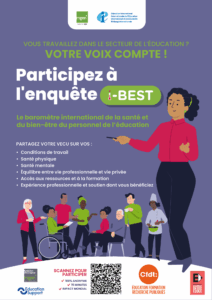 Prenez 15 minutes pour répondre à l’enquête I-BEST et contribuer à faire évoluer les politiques RH dans l’éducation. Cliquer sur le bouton ci-dessous pour remplir l’enquête. L’ensemble des réponses, collectées de manière anonyme dans notre pays et dans le monde entier, permettront de renforcer le plaidoyer en faveur de la santé au travail et du bien-être des personnels de l’éducation.