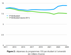 En euro constant (ligne verte), le financement des universités n’a pas évolué de 2011 à 2025. Voire il est en légère diminution.