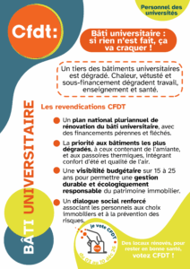 Pour la CFDT Éducation Formation Recherche Publiques, la rénovation du bâti universitaire constitue un investissement indispensable pour la santé, les conditions de travail, la réussite étudiante et l’adaptation au climat de demain.