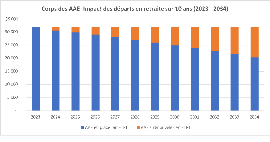 Avec 39 751 agents, le corps des AAE (attachés d’administration de l’État) représente 1,6 % des effectifs de la fonction publique de l’État. Depuis 2015, les effectifs ont fortement augmenté. Mais, cette hausse masque une réalité préoccupante : 1/3 des effectifs du corps doit être renouvelé entre 2023 et 2034 afin de couvrir les postes vacants et les départs massifs à la retraite.