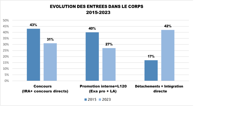 En 2015, les AAE étaient recrutés à 43% par les IRA et à 42% via promotion interne. Or, en 2023, le recrutement par les IRA ne représente plus que 31%. Dans la même période, l’entrée dans le corps par la voie du détachement passe de 17% à 43%.