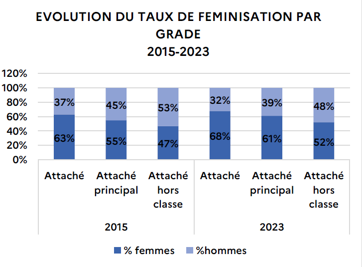 Les femmes représentent 64% des agents du corps. Malgré une féminisation croissante de chacun des grades depuis 2015, le taux de féminisation diminue au fur et à mesure que l’on progresse dans les grades du corps.