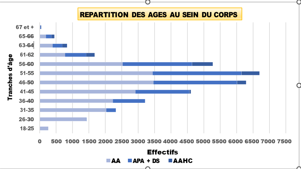 Le départ à la retraite représente 70% des sorties du corps en 2023. L’âge moyen atteint désormais 49 ans, avec un vieillissement constaté dans tous les grades.