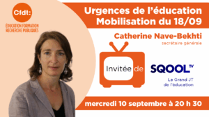 Invitée du « Grand JT de l’éducation », Catherine Nave-Bekhti explique pourquoi la CFDT Éducation Formation Recherche Publiques sera mobilisée le mercredi 18 septembre : services publics, justice sociale, conditions de travail dignes (durée de l’interview : 21:20).